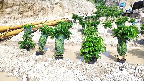 福建省漳浦縣非法開采企業(yè)將大量盆栽苗木簡單覆土,甚至直接擺放在砂場,搞“盆栽式復綠”。