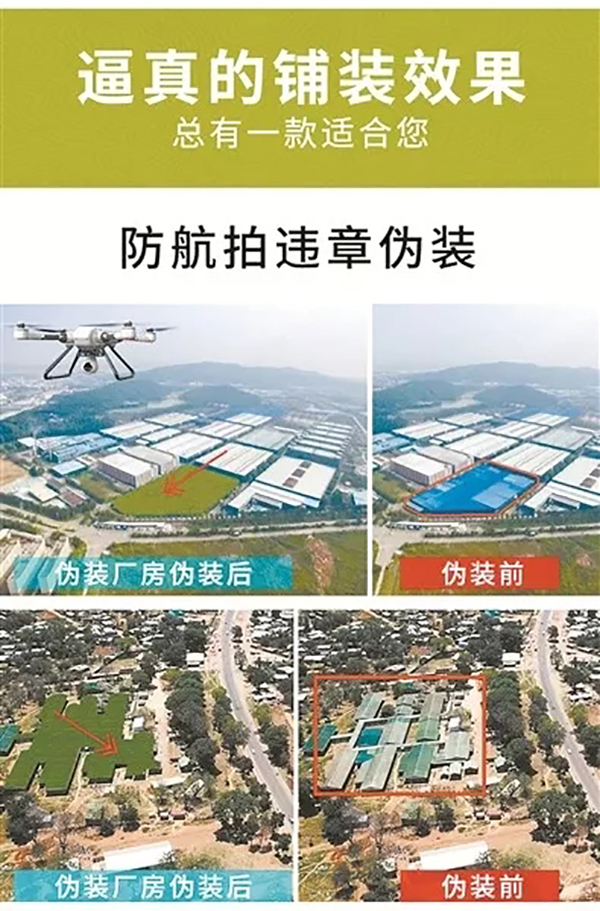 從賣家廣告和買家好評來看,“防航拍”效果不錯。其中,一家店鋪曬出了“綠化工程鋪裝”“廠房偽裝”“私建游泳池偽裝”“景區(qū)房屋偽裝”等多個“真實拍攝”的效果圖。一名網(wǎng)友留言:“防航拍用的,已經(jīng)全部安裝上了,這下不用擔心被拍到了,已經(jīng)推薦給隔壁。”