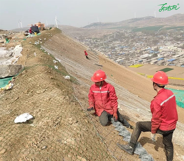 方法自上而下放卷,相鄰兩卷鋼絲網(wǎng)要求有10cm重疊。電錘鉆孔,用錨釘固定。